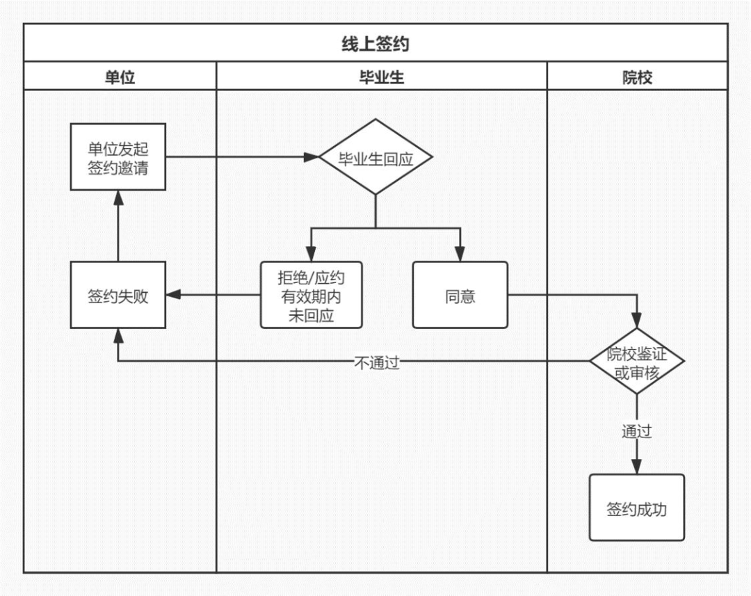 线上签约流程:用人单位通过登记系统向毕业生发起签约邀请,经毕业生同意、学校(院系)审核通过后,线上签约完成。