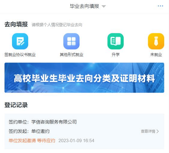 用人单位需先通过登记系统向毕业生发送签约邀请函,主界面会显示该签约邀请条目,点击可查看详细的单位及签约信息。