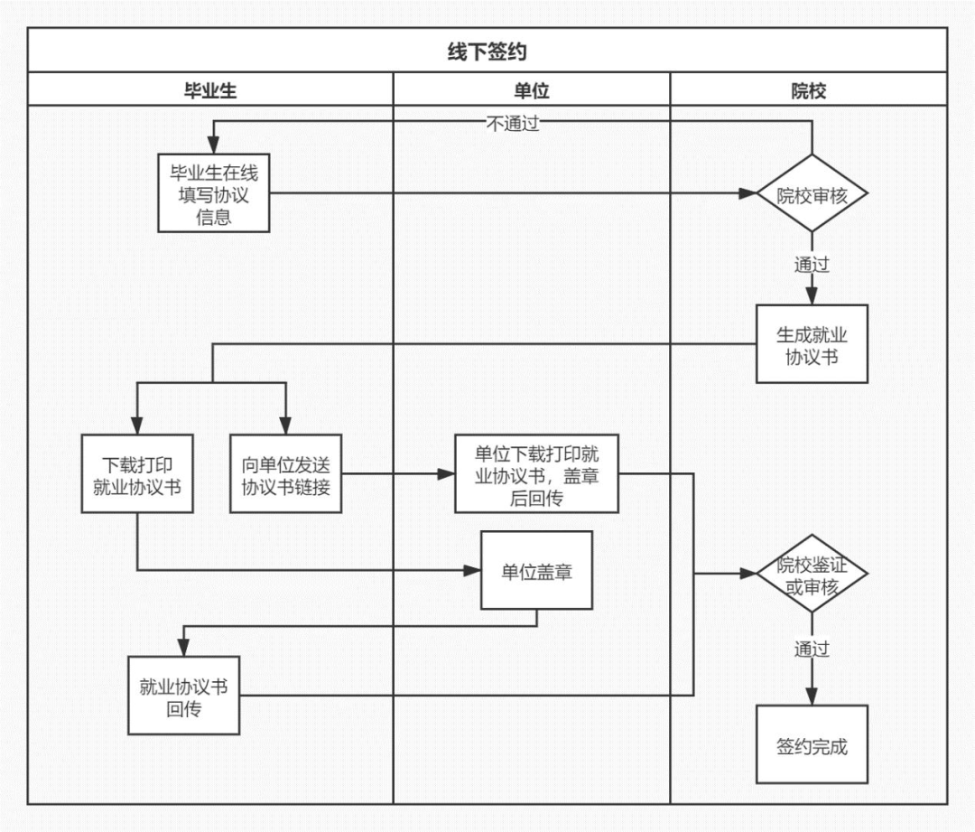 若审核不通过,线下签约申请直接作废,毕业生需重新在线填写就业协议信息再次提交审核。