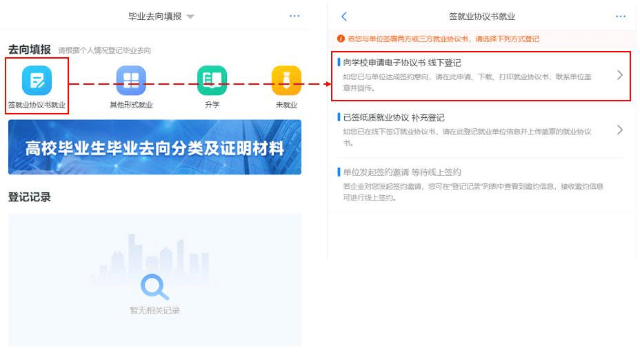 此功能适用于用人单位没有在登记系统注册,无法与用人单位线上签约的毕业生。