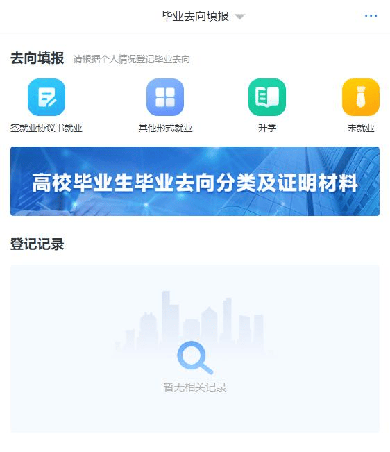 毕业生根据实际毕业去向,在主界面选择“其他形式就业”、“升学”或“未就业”,按照不同去向类型的具体要求,填写相关去向信息,上传证明材料。