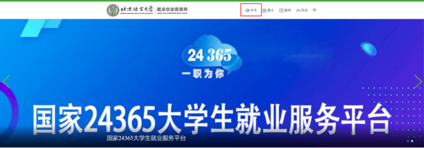 登录北京语言大学就业创业信息网(点击页面右上角“学生”按钮,使用数字北语账号密码登录或使用学号登录系统,初始密码为身份证号后八位(含 X 的需大写),如忘记密码请联系就业创业指导中心重置密码。