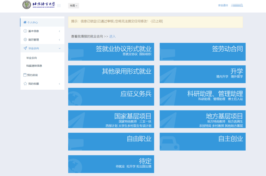 已落实毕业去向的毕业生点击左侧工具栏【毕业去向】,在线填报毕业去向并按照要求上传相应证明材料。