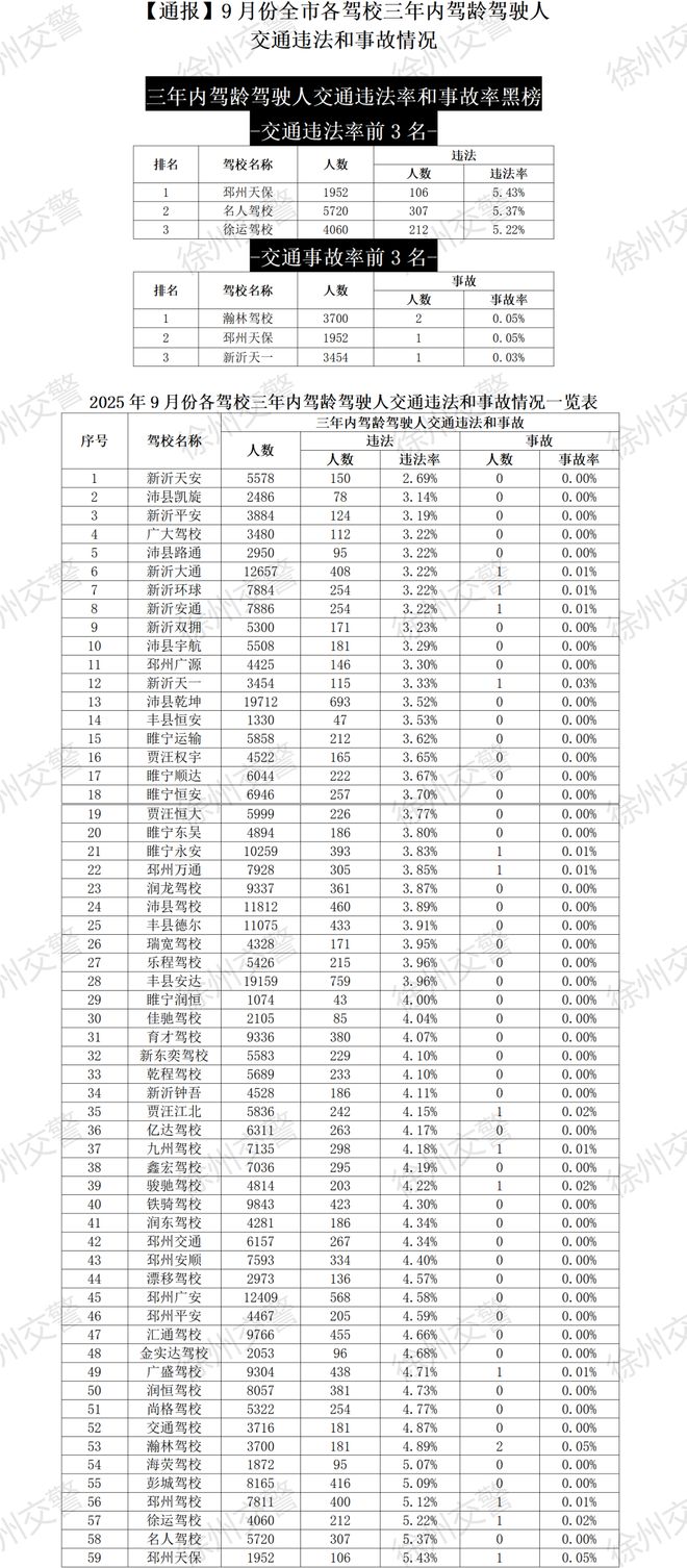 想学车的朋友看过来,徐州交警最新公布2025年9月份全市各驾校三年内驾龄驾驶人交通违法和事故情况,赶紧来看一看吧▼