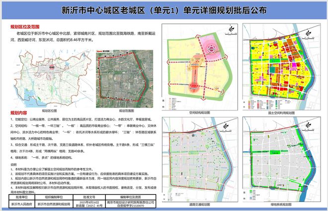 为加强和规范我市中心城区老城区国土空间规划管理,指导该片区规划建设,新沂市自然资源和规划局牵头组织编制了《新沂市中心城区老城区(单元1)单元详细规划》。目前该规划已经新沂市人民政府批复,依据《中华人民共和国城乡规划法》要求,现将《新沂市中心城区老城区(单元1)单元详细规划》主要内容向社会公布。