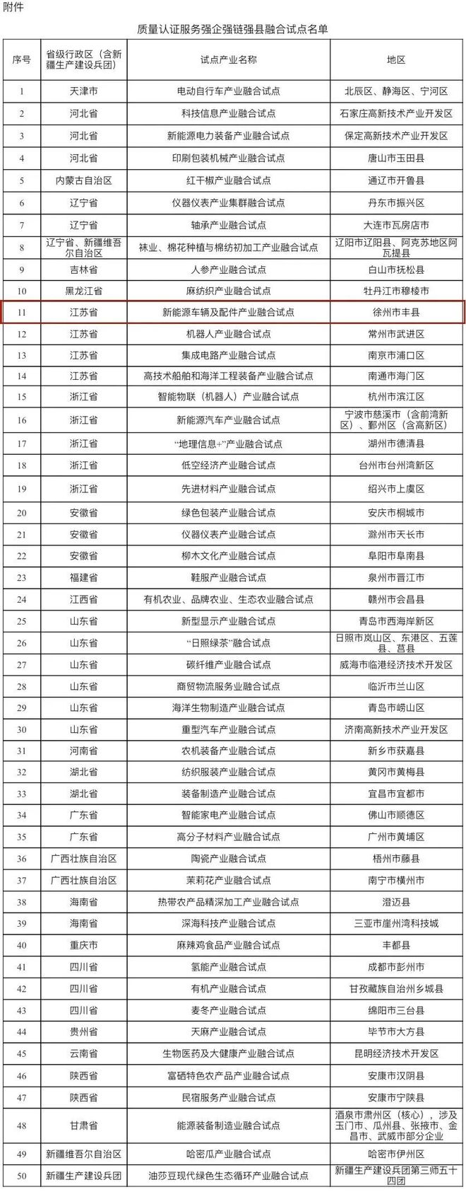 日前,国家认证认可监督管理委员会印发通知,公布首批质量认证服务强企强链强县融合试点名单。此次试点共有50个项目,涉及全国24个省、自治区、直辖市及新疆生产建设兵团,涵盖机器人、人工智能等未来产业,新能源产业、低空经济等战略性新兴产业,以及生态康养、民宿服务等现代服务业。其中,徐州丰县新能源车辆及配件产业融合试点入选。