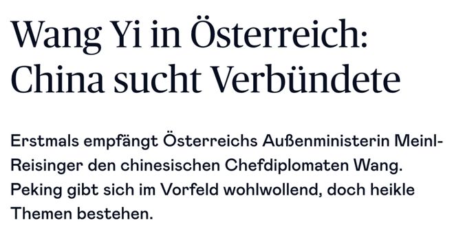 中国外交部在访问前表示友好:认为中奥双边关系总体“发展良好”。王毅希望就“深化双边与多边合作”进行深入交流。
